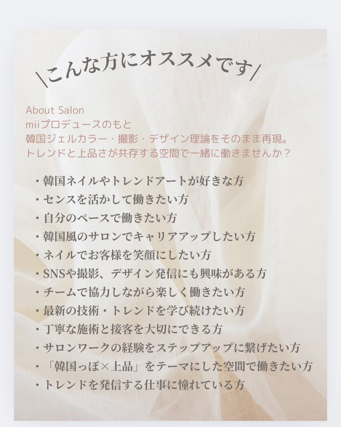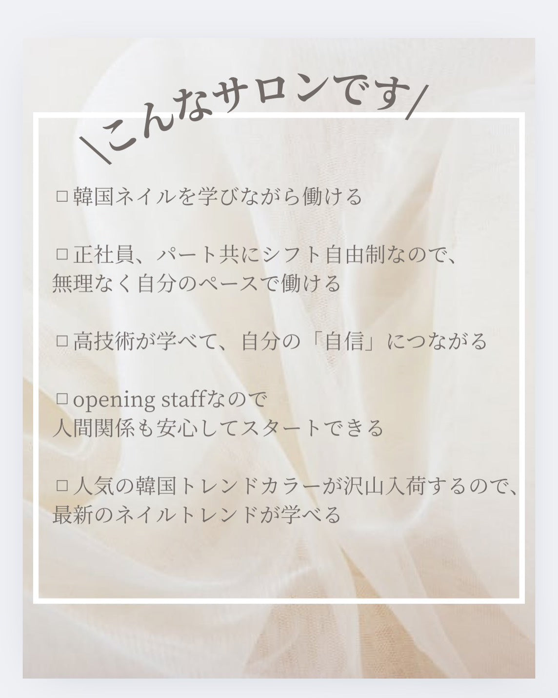 私たちと一緒にネイルサロンを盛り上げてくださる仲間を募集しています✨「新しいことにチャレンジしたい」「お客様に喜んでもらいたい」そんな熱意のある方、未経験の方も大歓迎です‼️